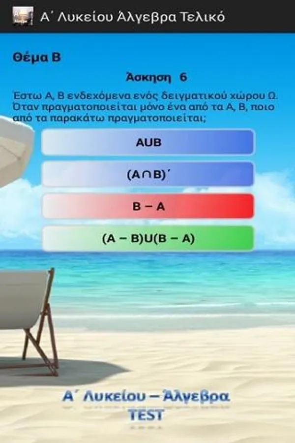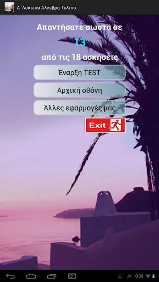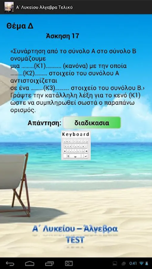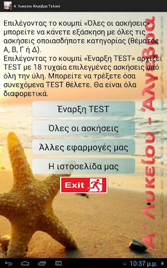 TEST of the 18 exercises, in 4 themes. Each test has: 5 exercises correct - wrong, 5 multiple choice, 4 multiple choice with image, 4 problems to solve. The exercises in this case are randomly chosen from the application's exercise base, and for that reason never two TESTs will be the same, since millions of exercise combinations are created without exaggeration. So the student can run as many consecutive tests as he does without the same exercises. In a short time he can control his knowledge without the tedious but mostly time-consuming writing.
