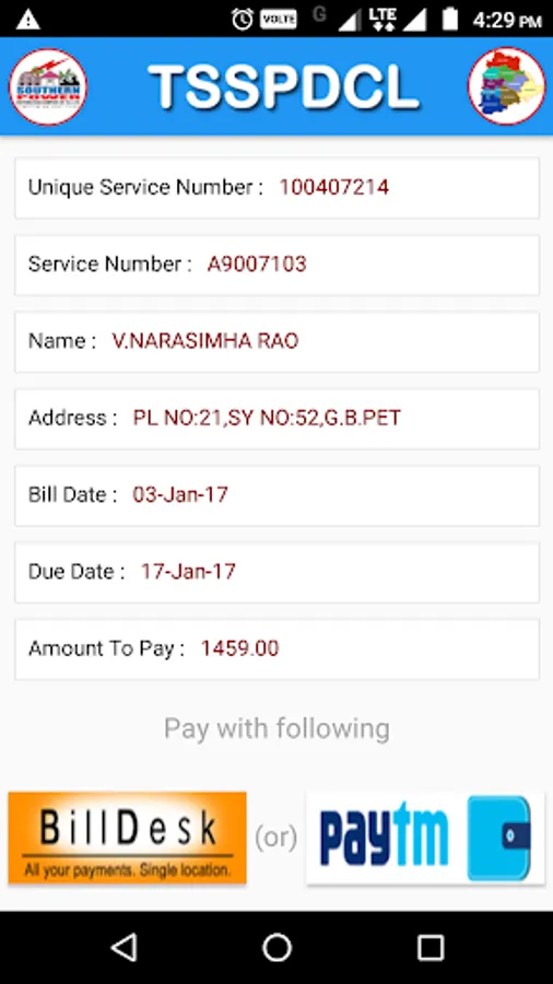 Telangana State Southern Power Distribution Company Limited Provides following features to the consumers through Mobile App.