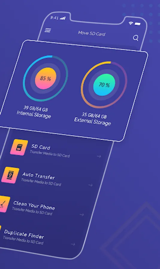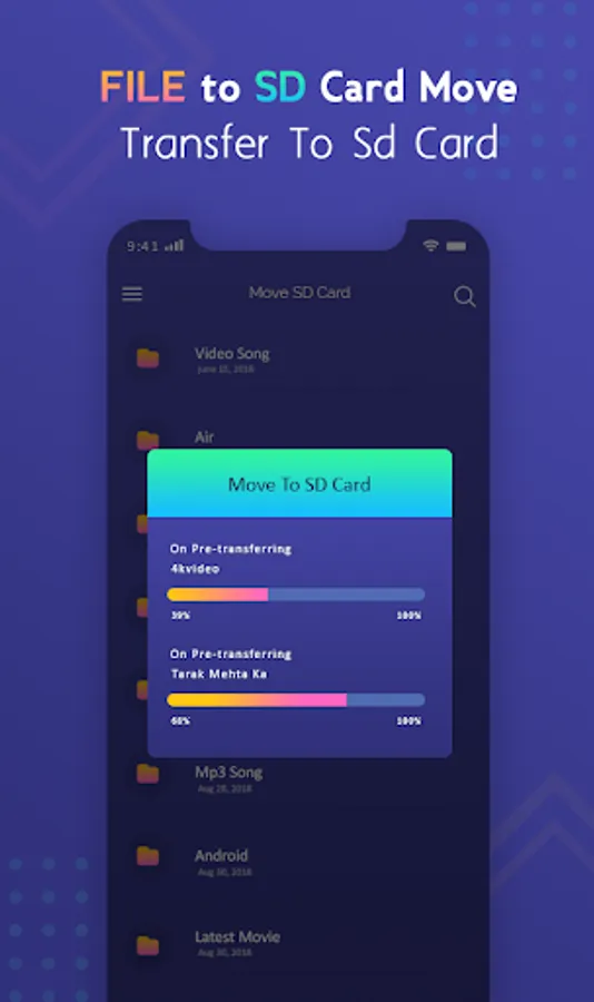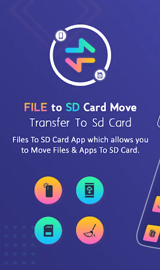 This application Files To SD Card is a one click fast solution to move your files from internal memory to SD card in your phone. Move your photos, videos and other downloads to your SD card. This application Files To SD Card is useful for devices with small internal memory and which do not allow saving your files directly to SD card.