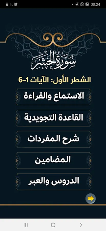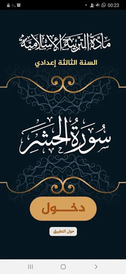 A special application for the third year of preparatory education that deals with Surat Al-Hashr by displaying everything related to the Surah, including explanations, contents, rules of intonation, fame, adoros and learned, and it also provides the ability to read and listen to the surah with a workshop narration, and Moroccan calligraphy, in addition to a set of evaluation questions.