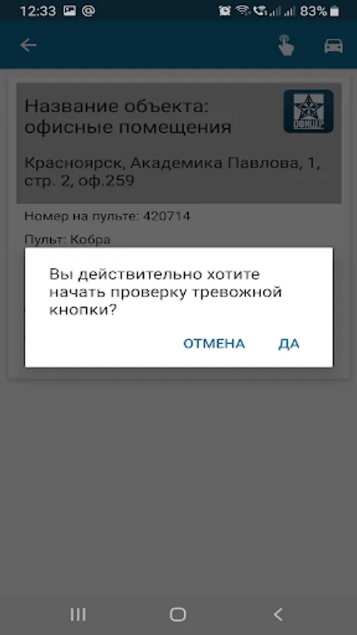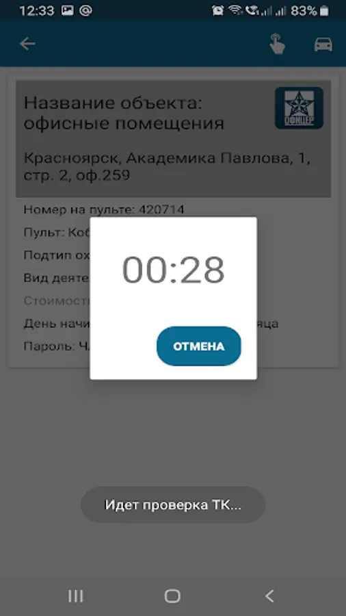 Mobile application Client CUR "Officer" is designed to control the removal / staging of an object (several objects) under protection, balance for security services. Allows you to check the panic button without contact with the security operator and much more. Write a request by e-mail vikuragan@mail.ru and we will connect you under protection in any city in Russia.