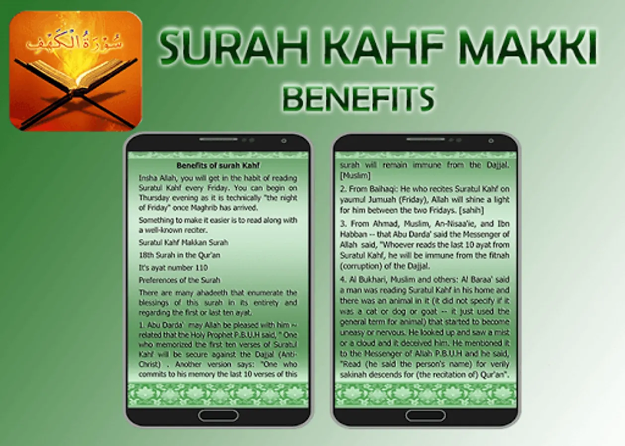 2. From Baihaqi: He who recites Suratul Kahf on yaumul Jumuah (Friday), Allah will shine a light for him between the two Fridays. [sahih]