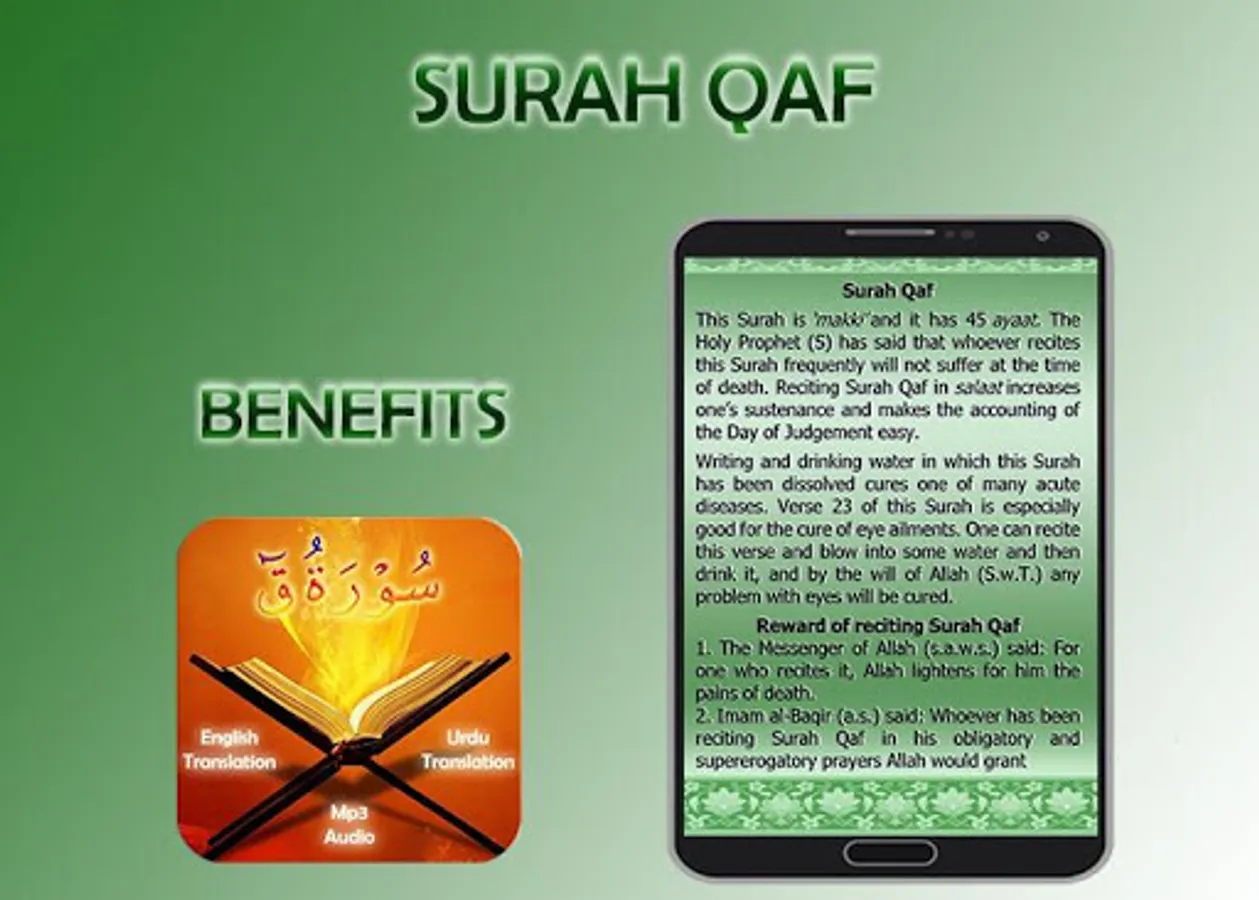 This Surah is ‘makki’ and it has 45 ayaat. The Holy Prophet (S) has said that whoever recites this Surah frequently will not suffer at the time of death. Reciting Surah Qaf in salaat increases one’s sustenance and makes the accounting of the Day of Judgement easy.