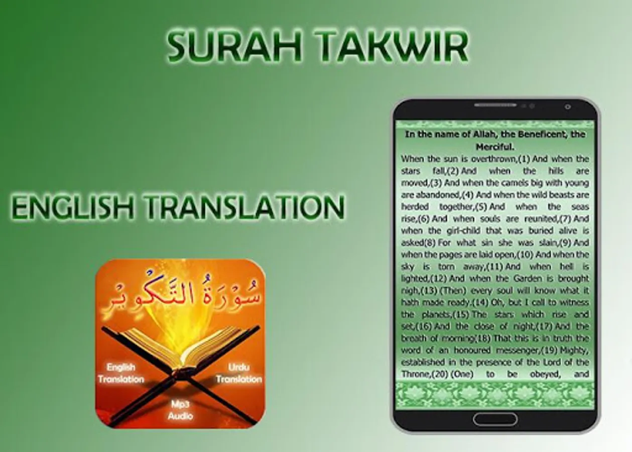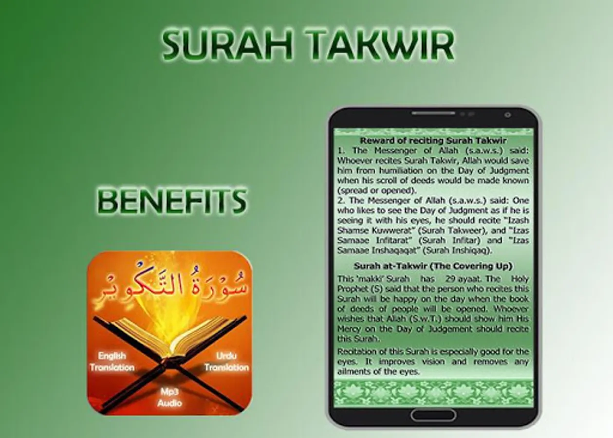 1. The Messenger of Allah (s.a.w.s.) said: Whoever recites Surah Takwir, Allah would save him from humiliation on the Day of Judgment when his scroll of deeds would be made known (spread or opened).
