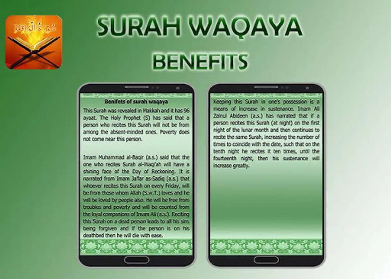 Imam Muhammad al-Baqir (a.s.) said that the one who recites Surah al-Waqi’ah will have a shining face of the Day of Reckoning. It is narrated from Imam Ja’far as-Sadiq (a.s.) that whoever recites this Surah on every Friday, will be from those whom Allah (S.w.T.) loves and he will be loved by people also. He will be free from troubles and poverty and will be counted from the loyal companions of Imam Ali (a.s.). Reciting this Surah on a dead person leads to all his sins being forgiven and if the person is on his deathbed then he will die with ease.