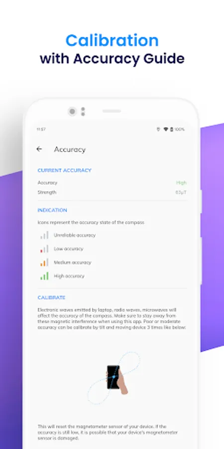 π The accuracy of the compass will interfere when the device is near any other magnetic interference. Stay away from magnetic objects such as another electronic device, battery, magnet, etc while using the compass application. If the accuracy becomes unreliable, calibrate the device by simultaneously flipping and moving the phone back and front in patterns 8(as screenshot shown).