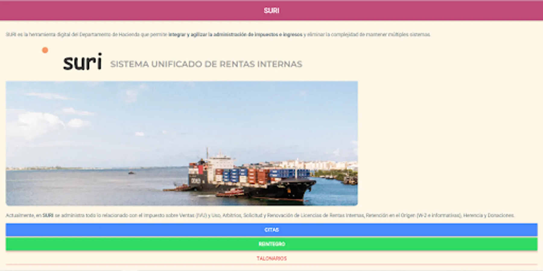 Suri is the digital tool of the Department of Finance (PR.GOV) that allows to integrate and expedite tax and income administration and eliminate the complexity of maintaining multiple systems. Currently, in Suri everything related to sales tax (IVU) and use, arbitration, request and renewal of internal income licenses, retention at the origin (W-2 and informative), inheritance and donations is administered.