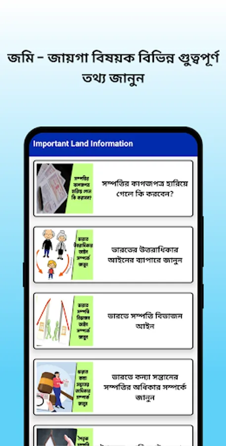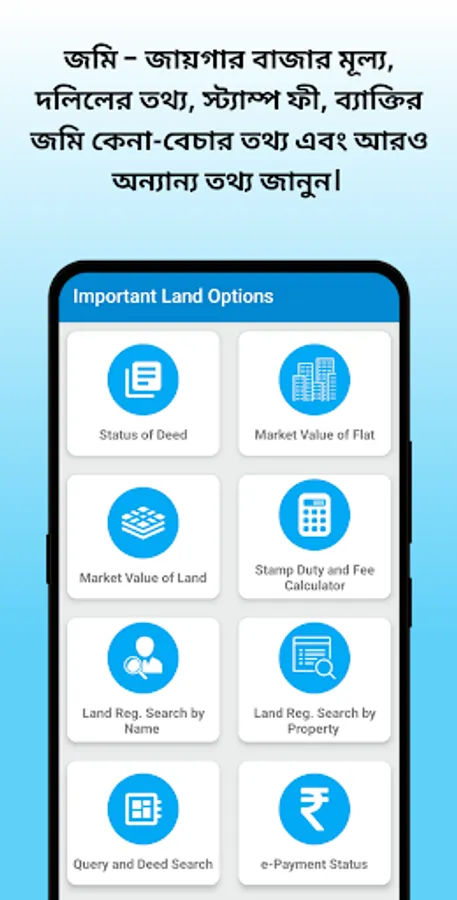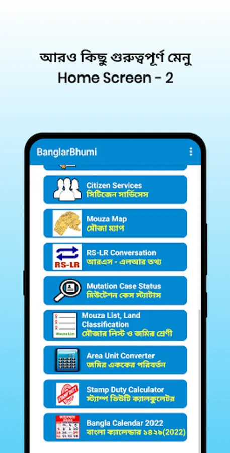 বাংলার ভূমি অ্যাপের সাহায্যে আপনারা যেকোনো জমি-জায়গার সমস্ত তথ্য যেমন - খতিয়ান, দাগ, মার্কেট ভ্যালু, স্ট্যাম্প ডিউটি, এরিয়া ক্যালকুলেটর, ল্যান্ড রেকর্ড এবং আরও অনেক তথ্য সহজেই পেয়ে যাবেন।