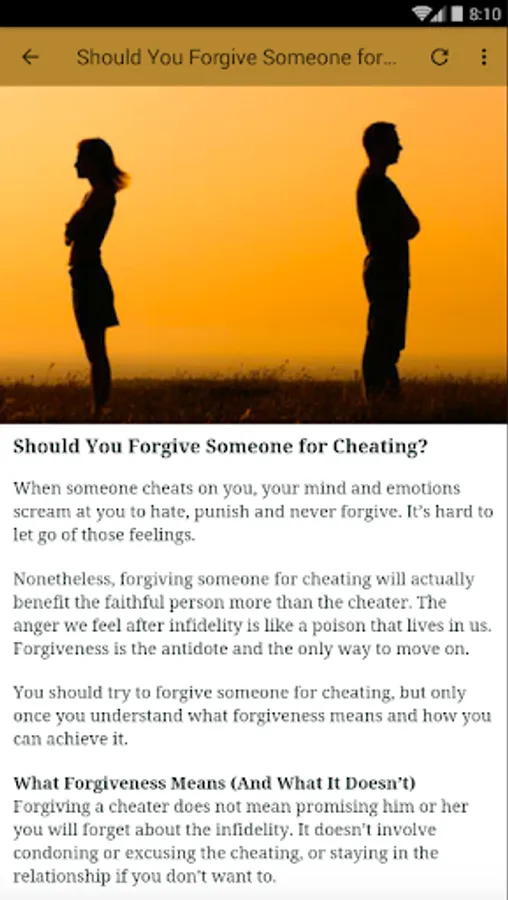 Infidelity is breaking a promise to remain faithful to a romantic partner. That promise can take many forms, from marriage vows sanctified by the state to privately uttered verbal agreements between lovers. As unthinkable as the notion of breaking such bonds may be, infidelity is common. And when it does happen, it raises thorny and painful questions. Should you stay? Can trust be rebuilt? Can you and should you forgive and move on?