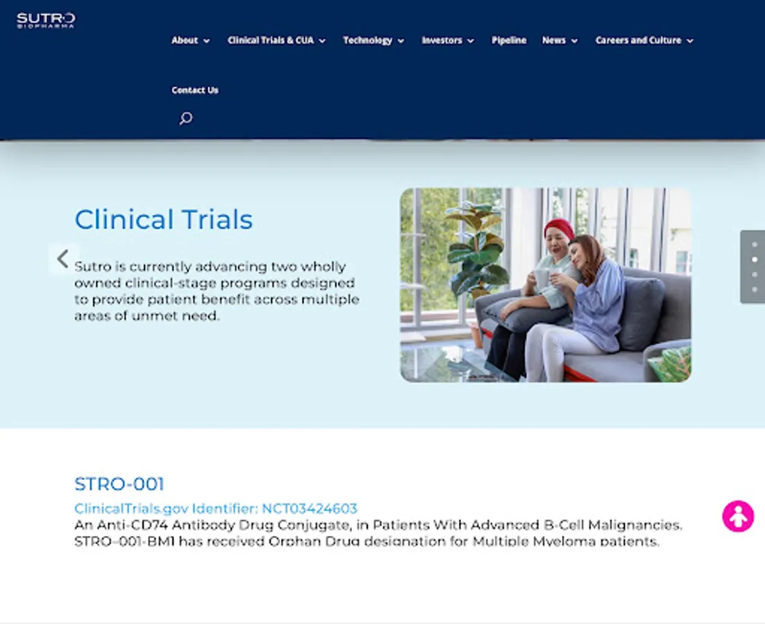 Sutro Biopharma, Inc., headquartered in South San Francisco, is a clinical-stage oncology company pioneering site-specific and novel-format antibody drug conjugates (ADCs). Sutro has two wholly owned ADCs in the clinic—luveltamab tazevibulin (STRO-002 or luvelta), a folate receptor alpha (FolRα)-targeting ADC, in clinical studies for ovarian and endometrial cancers; and STRO-001, a CD74-targeting ADC, in clinical studies for B-cell malignancies. Additionally, Sutro is collaborating with Bristol Myers Squibb (BMS) on CC-99712, a BCMA-targeting ADC in the clinic for patients with multiple myeloma; with Merck KGaA, Darmstadt, Germany, known as EMD Serono in the U.S. and Canada (EMD Serono), on M1231, a MUC1-EGFR bispecific ADC in clinical studies for patients with solid tumors, particularly non-small cell lung cancer (NSCLC) and esophageal squamous cell carcinoma; with Merck, known as MSD outside of the United States and Canada, on MK-1484, a selective IL-2 agonist in clinical studies as a monotherapy and in combination with pembrolizumab for the treatment of solid tumors; and with Astellas Pharma (Astellas) on novel modality, immunostimulatory antibody-drug conjugates (iADCs). Sutro’s platform technology also enabled the spin out of Vaxcyte and the creation of VAX-24, a 24-valent pneumococcal conjugate vaccine in clinical studies for the prevention of invasive pneumococcal disease. Sutro’s rational design and precise protein engineering has enabled six product candidates in the clinic. Follow Sutro on Twitter, @Sutrobio, and at www.sutrobio.com to learn more about our passion for changing the future of oncology.