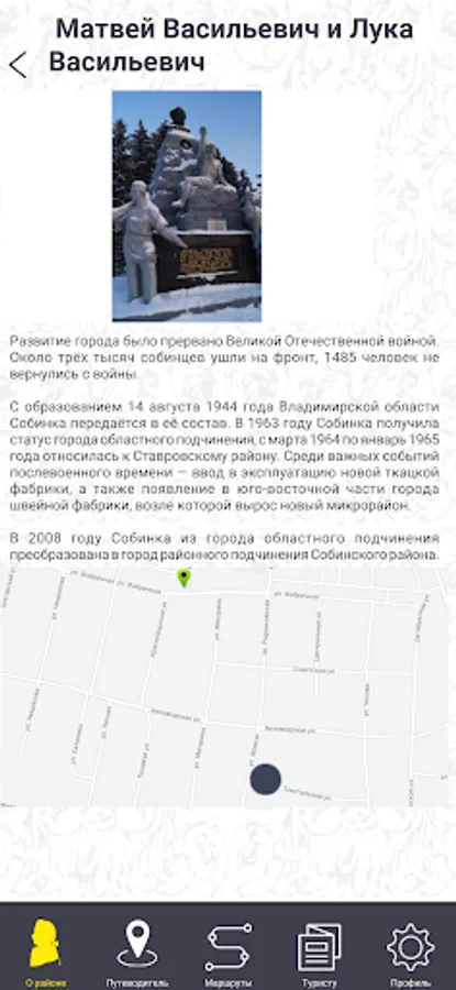 Проект подразумевает разработку нового туристического маршрута «По Суворовским местам», создание портала и мобильного приложения для развития туруслуг в Собинском районе