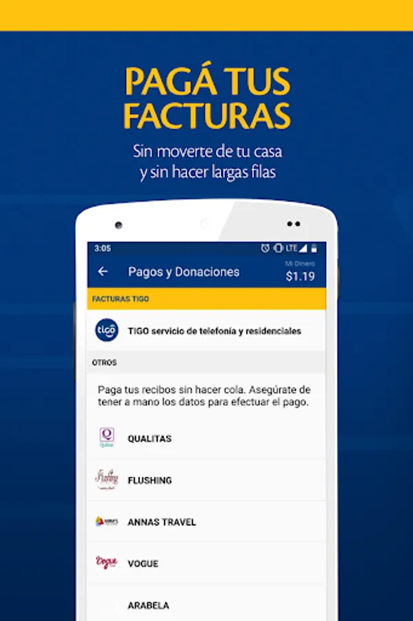 Take advantage and pay for your services with your Tigo Money digital wallet. You can pay your Tigo account and your public services in the same place.