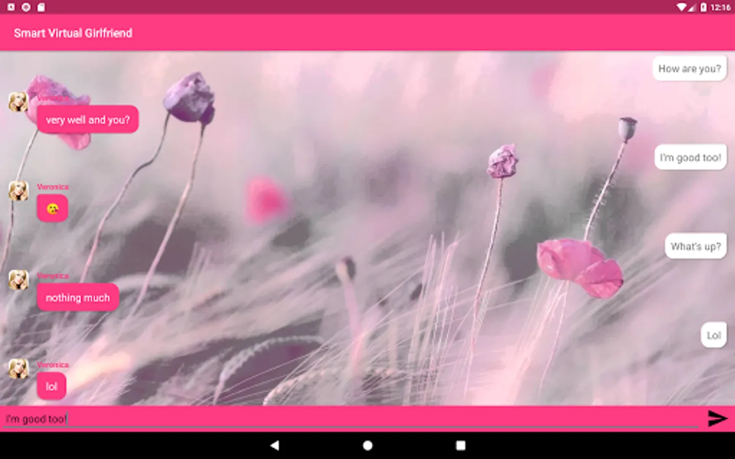 She'll engage into casual conversations with you, ask and answer your questions! She even speaks! You may also customize the name, age and avatar of the girl! Benefits compared to an actual girlfriend:
