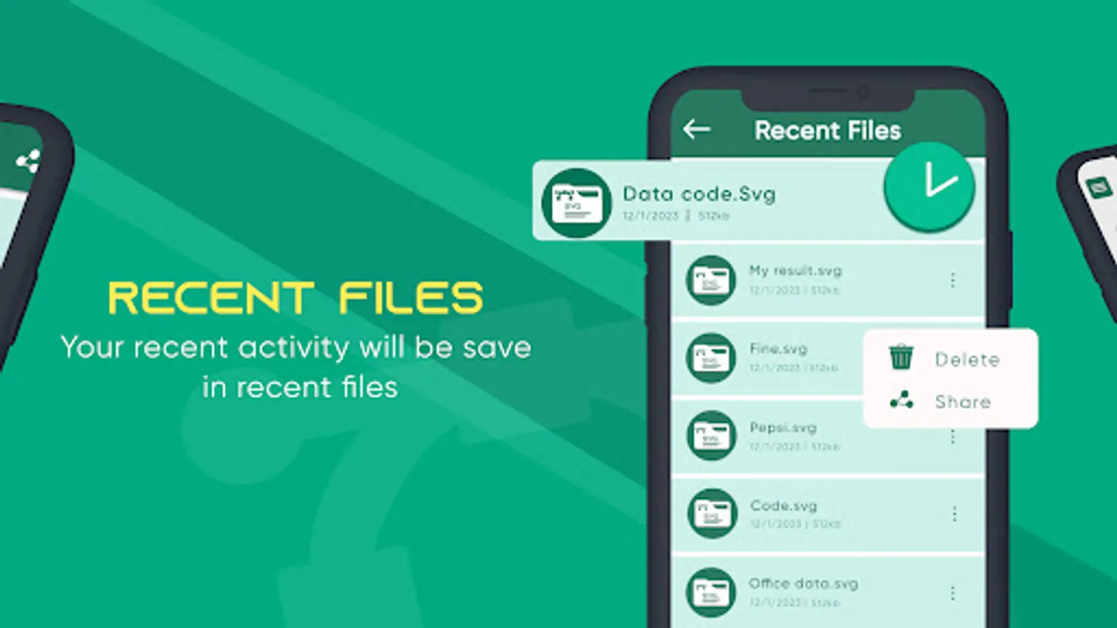 2. The SVG converter free app has four main features; SVG viewer, SVG code, converted files, and recent files. The first feature of a SVG to png converter is SVG viewer. This feature permits the user to open all the SVG files. A list will appear that mentions the date of creation, file size, and the title of that particular file. The user can open the file directly by clicking on it. They can also search for any particular file using the search bar at the top. Using this feature, one can also delete the file directly from the app, without closing it. Finally, the user can convert the image into PNG, JPG, or PDF formats.