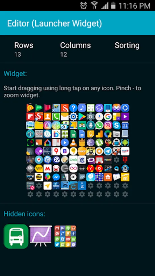 This widget shows all your installed apps as small icons on your screen and shows you a zoom window when you touch any of them. Widget saves positions of icons and updates list of apps like app drawer. It saves your time - because it's easy to find icon when all icons are on one screen.