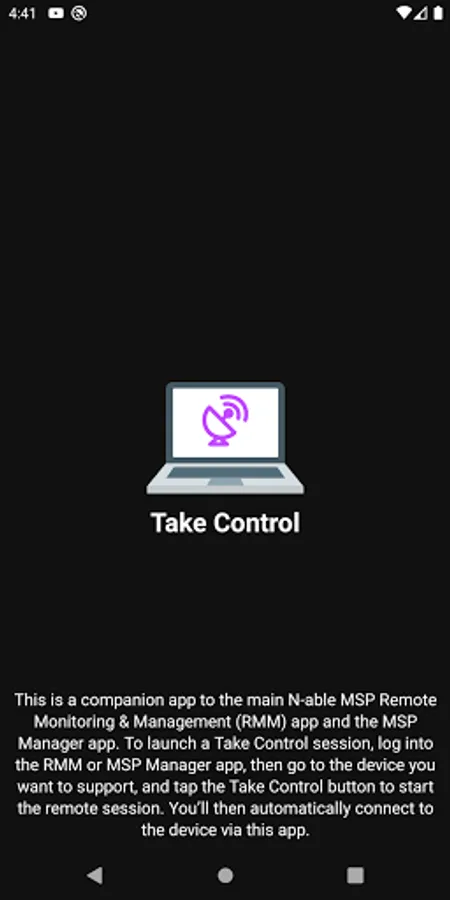 This is a companion app to the main N-able Remote Monitoring & Management (RMM) app. It will automatically start a Take Control session for you when you select this feature in the RMM app: Simply go to the workstation you want to support, tap the Take Control button to start the remote session, and the app will automatically take care of the rest.