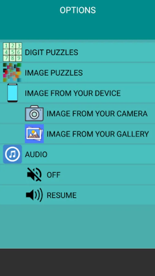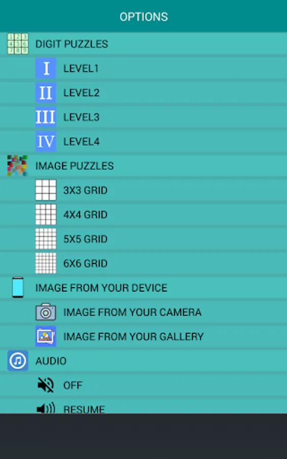 3.If you want to use the camera of your device to get a picture and load it as a puzzle, choose IMAGE FROM YOUR CAMERA. Please take pictures in landscape orientation, to get the right position of your puzzle.