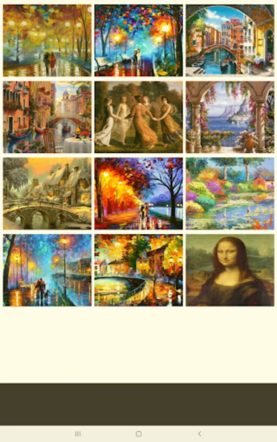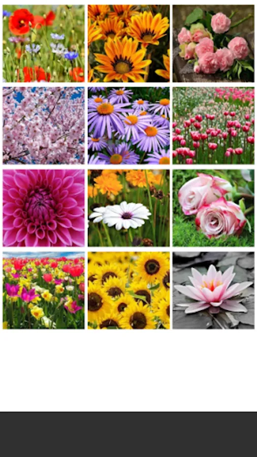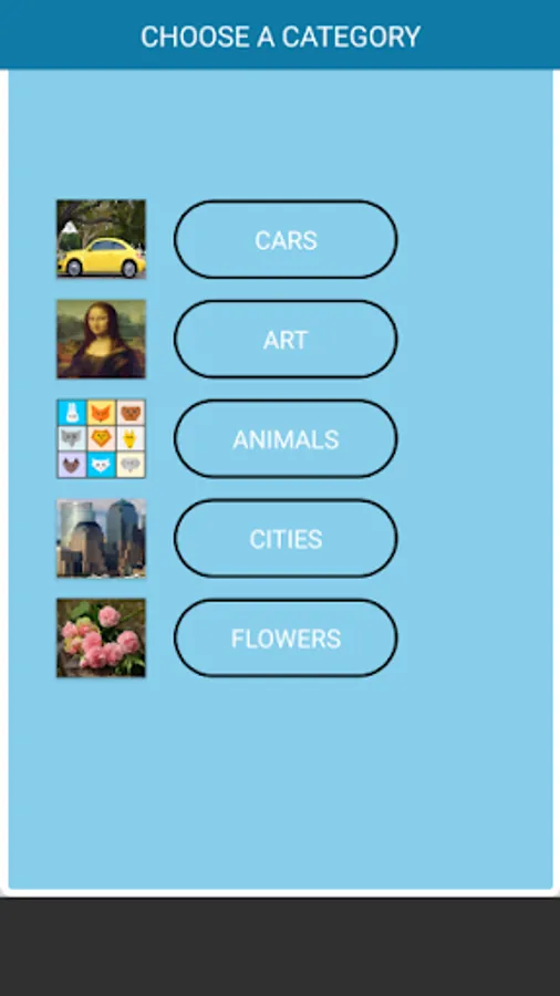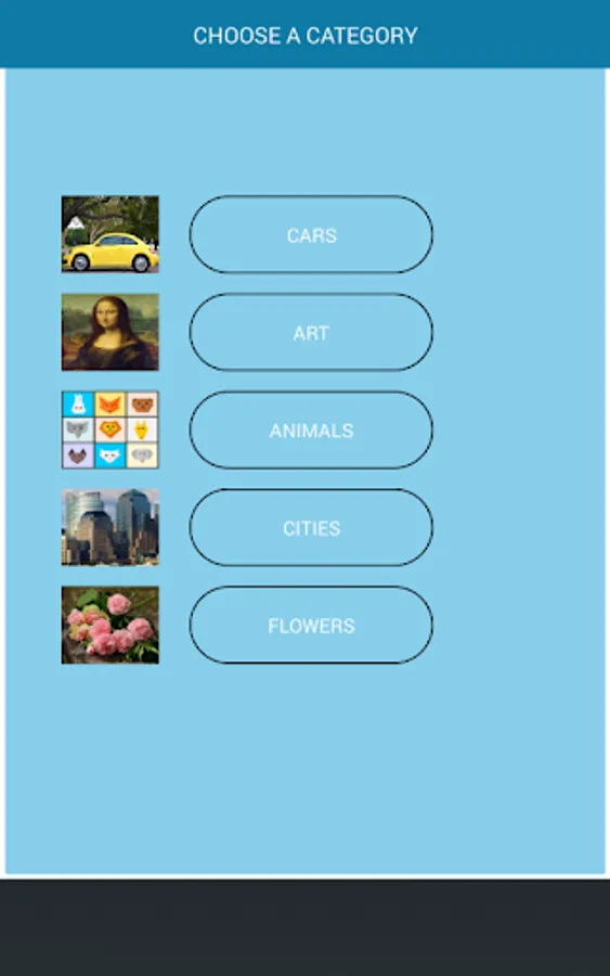 There are other 4 levels of IMAGE PUZZLES (with grids of 3x3, 4x4, 5x5 and 6x6) and with 6 categories of images: CARS, ART, ANIMALS, CITIES and FLOWERS. There are very beautiful 72 images in these categories.