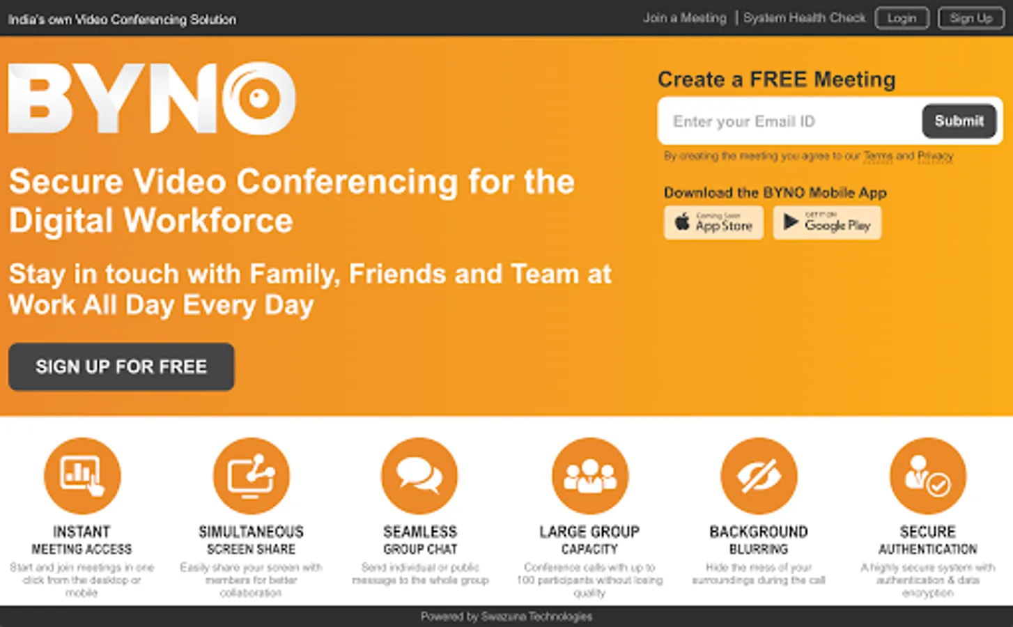 BYNO is a highly secure free Video Conferencing Solution with data encryption for the Digital Workforce. BYNO makes it easy to maintain human connections, irrespective of physical location. It is a completely Made in India product built for the Web and Mobile, Voice and HD Video Calling.