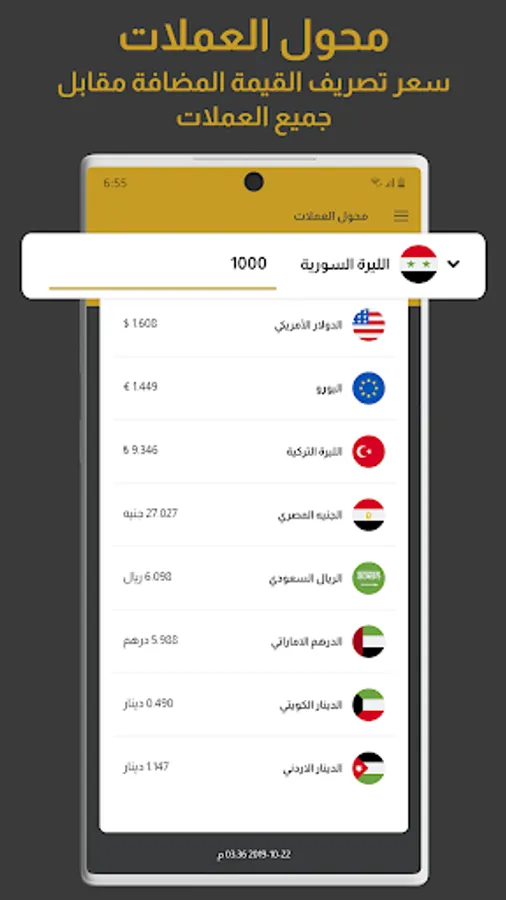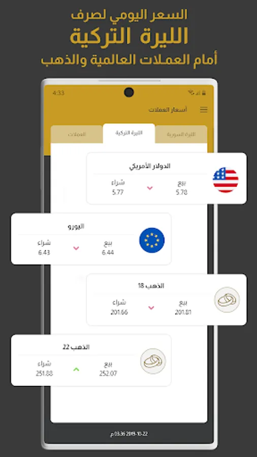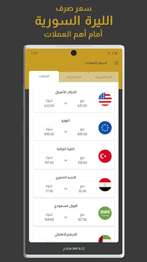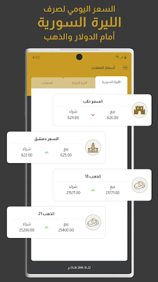 The best application in the provision of exchange rates gold prices and currency conversion, as its goal to serve the Syrians offers the price of the Syrian pound first and then the Turkish lira.