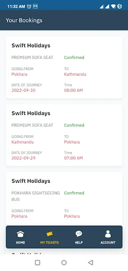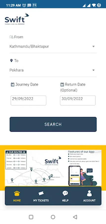 Swift Holidays a bus ticket booking portal introduced by Swift Holidays Pvt. Ltd. a intercity bus operator based in Nepal. Swift Holidays operates daily intercity bus services between major tourist destinations in Nepal such as, Kathmandu, Pokhara, Sauraha / Chitwan, Bhairahawa and Lumbini. This app features realtime selection of seats, bus ticket booking with no extra charges. Tickets can be purchased through digital wallets, mobile & internet banking, international Visa and Master Cards.