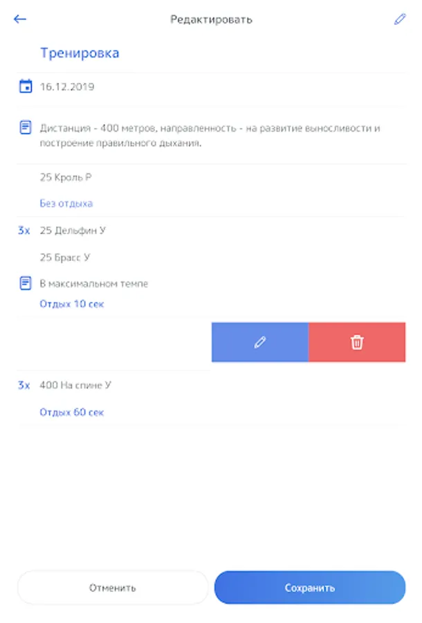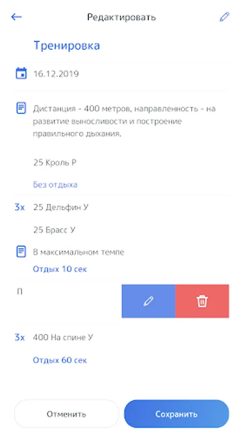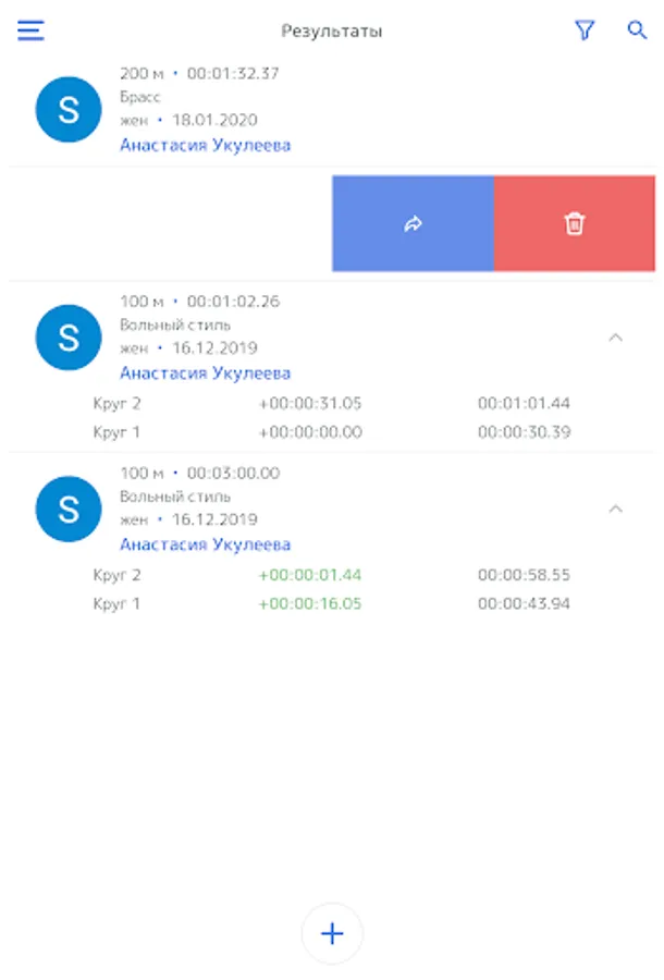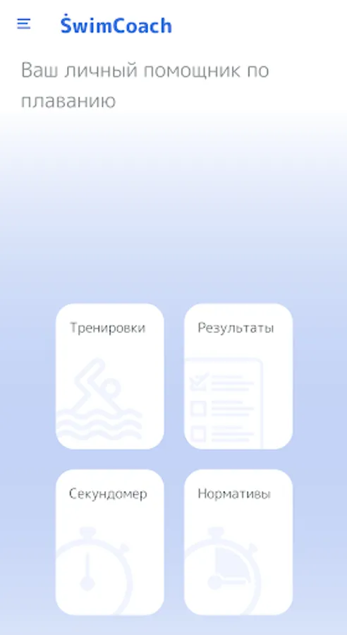 The application includes the rules and regulations for swimming, the user's personal account, creating and editing workouts, a built-in stopwatch (regular and four-hand, allowing you to workout at a given pace), a protest form, the ability to save results with sorting and filters.