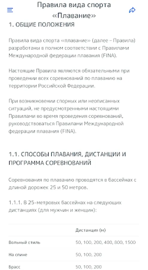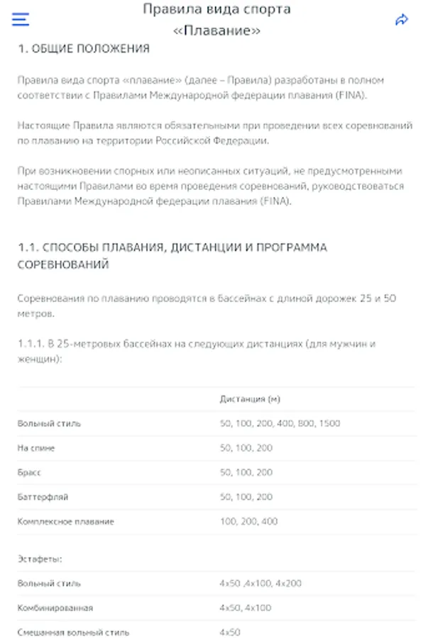• Quick access to regulations and requirements in accordance with the rules of the International Swimming Federation (FINA)