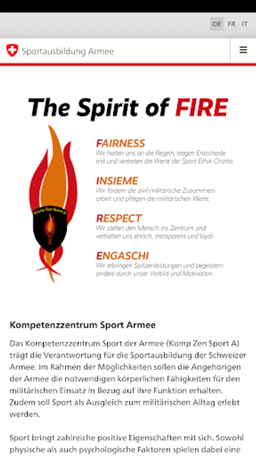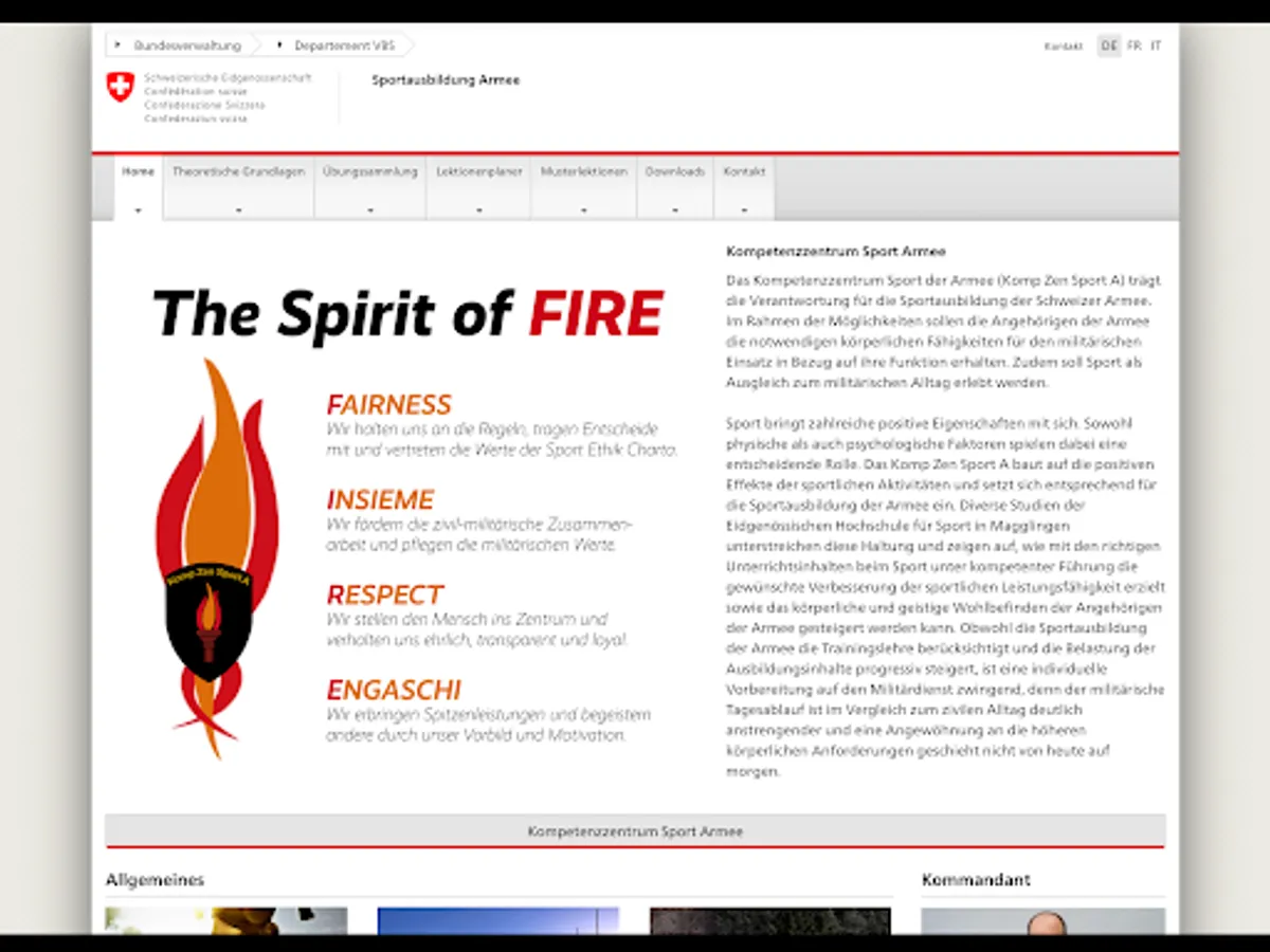 The Armed Forces Sports Competence Center (Komp Zen Sport A) is responsible for sports training for the Swiss Armed Forces. As far as possible, the members of the army should receive the necessary physical abilities for military use in relation to their function. In addition, sport should be experienced as a balance to everyday military life.