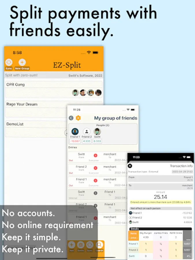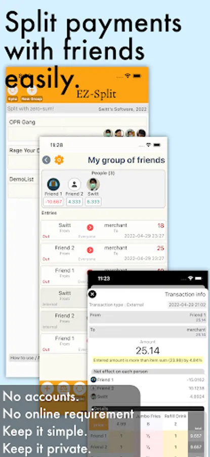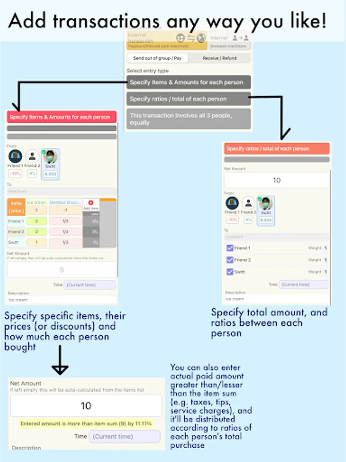 - You can specify individual item prices, how much each person bought (and you can even enter fractions! Like Mr. Champ owes 1/3 of the pizza price while you owe 2/3 of the price!)
