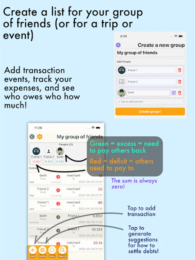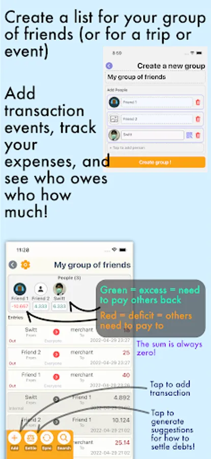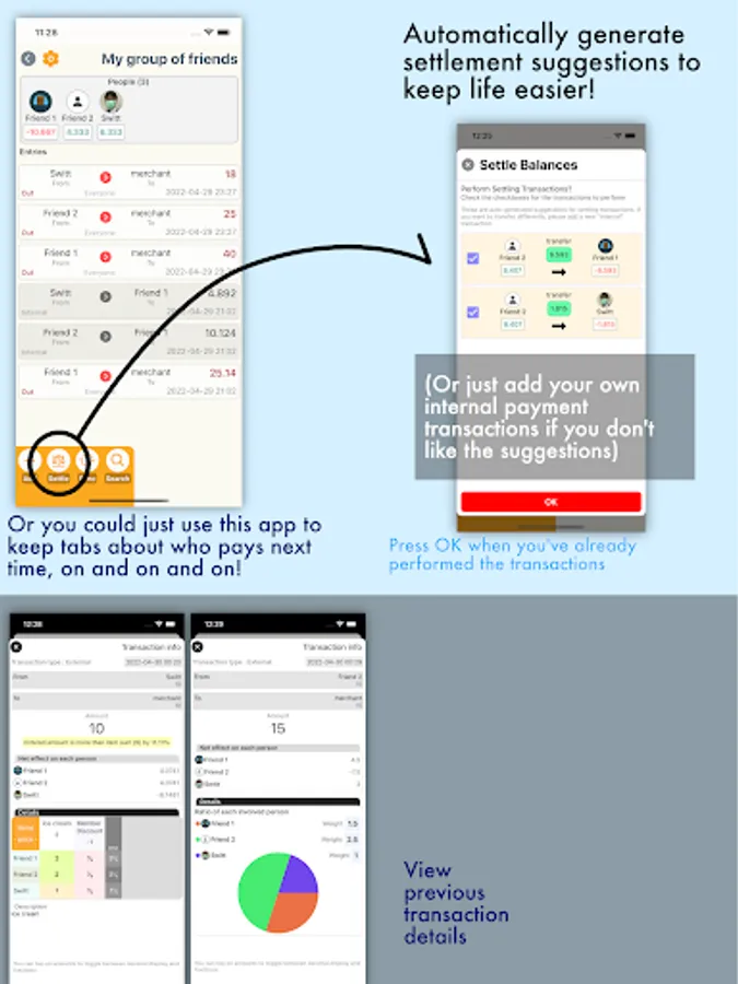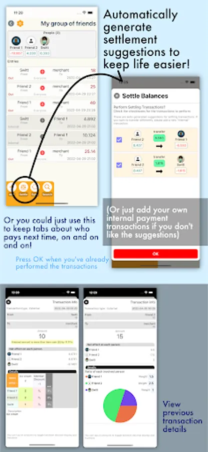 - For auto Settlement suggestion generation, press on the "Settle" button at the bottom left of the screen, and it'll show you the appropriate transactions between your friends to settle your debts (who has to pay who how much)