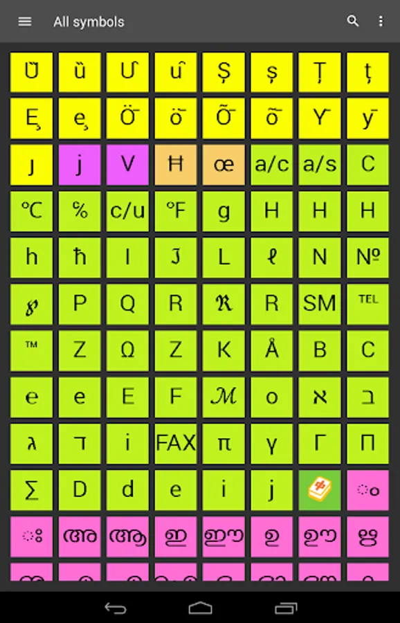 Basic Symbols, Basic Latin, Latin-1 Supplement, IPA Extensions, Spacing Modifier Letters, Combining Diacritical Marks, Greek and Coptic, Cyrillic (Russian), Cyrillic Supplement, Armenian, Hebrew, Arabic, Syriac, Arabic Supplement, Thaana, NKo, Samaritan, Mandaic, Devanagari, Bengali, Gurmukhi, Gujarati, Oriya, Tamil, Telugu, Kannada, Malayalam, Sinhala, Thai, Lao, Tibetan, Myanmar, Georgian, Hangul Jamo, Ethiopic, Ethiopic Supplement, Cherokee, Unified Canadian Aboriginal Syllabics, Ogham, Runic, Tagalog, Hanunoo, Buhid, Tagbanwa, Khmer, Mongolian, Limbu, Tai Le, New Tai Lue, Khmer Symbols, Buginese, Tai Tham, Balinese, Sundanese, Batak, Lepcha, Ol Chiki, Sundanese Supplement, Vedic Extensions, Phonetic Extensions, General Punctuation, Superscripts and Subscripts, Currency Symbols, Combining Diacritical Marks for Symbols, Letterlike Symbols, Number Forms, Mathematical Operators, Miscellaneous Technical, Control Pictures, Optical Character Recognition, Enclosed Alphanumerics, Box Drawing, Block Elements, Geometric Shapes, Dingbats, Miscellaneous Mathematical Symbols-A, Braille Patterns, Glagolitic, Coptic, Georgian Supplement, Tifinagh, Kangxi Radicals, Ideographic Description Characters, CJK Symbols and Punctuation, Hiragana, Katakana, Bopomofo, Hangul Compatibility Jamo, Kanbun, Enclosed CJK Letters and Months, CJK Compatibility, CJK Unified Ideographs Extension A, Yijing Hexagram Symbols, CJK Unified Ideographs, Yi Syllables, Yi Radicals, Lisu, Vai, Bamum, Modifier Tone Letters, Syloti Nagri, Common Indic Number Forms, Phags-pa, Saurashtra, Kayah Li, Rejang, Javanese, Cham, Tai Viet, Meetei Mayek Extensions, Cherokee Supplement, Meetei Mayek, Hangul Syllables, High Surrogates, High Private Use Surrogates, Low Surrogates, Private Use Area, CJK Compatibility Ideographs, Alphabetic Presentation Forms, Arabic Presentation Forms-A, Variation Selectors, Vertical Forms, Combining Half Marks, CJK Compatibility Forms, Small Form Variants, Arabic Presentation Forms-B, Halfwidth and Fullwidth Forms, Specials, Linear B Syllabary, Linear B Ideograms, Aegean Numbers, Ancient Greek Numbers, Ancient Symbols, Phaistos Disc, Lycian, Carian, Coptic Epact Numbers, Old Italic, Gothic, Old Permic, Ugaritic, Old Persian, Deseret, Shavian, Osmanya, Old South Arabian, Old North Arabian, Manichaean, Avestan, Inscriptional Parthian, Inscriptional Pahlavi, Enclosed Ideographic Supplement, Emoticons (Emoji), Transport and Map Symbols and all the rest!!