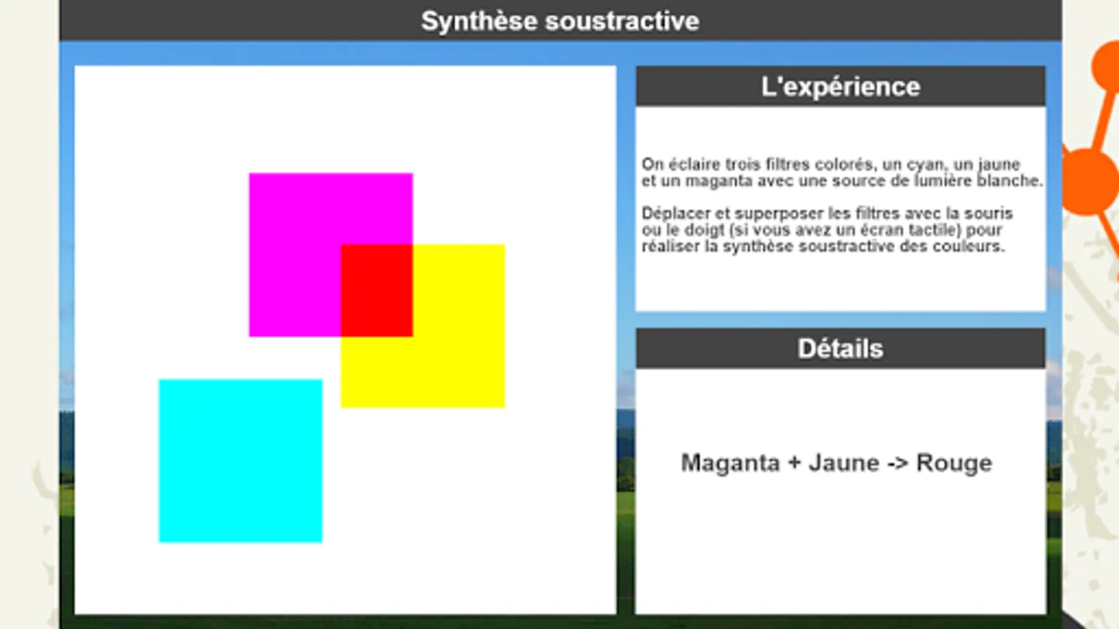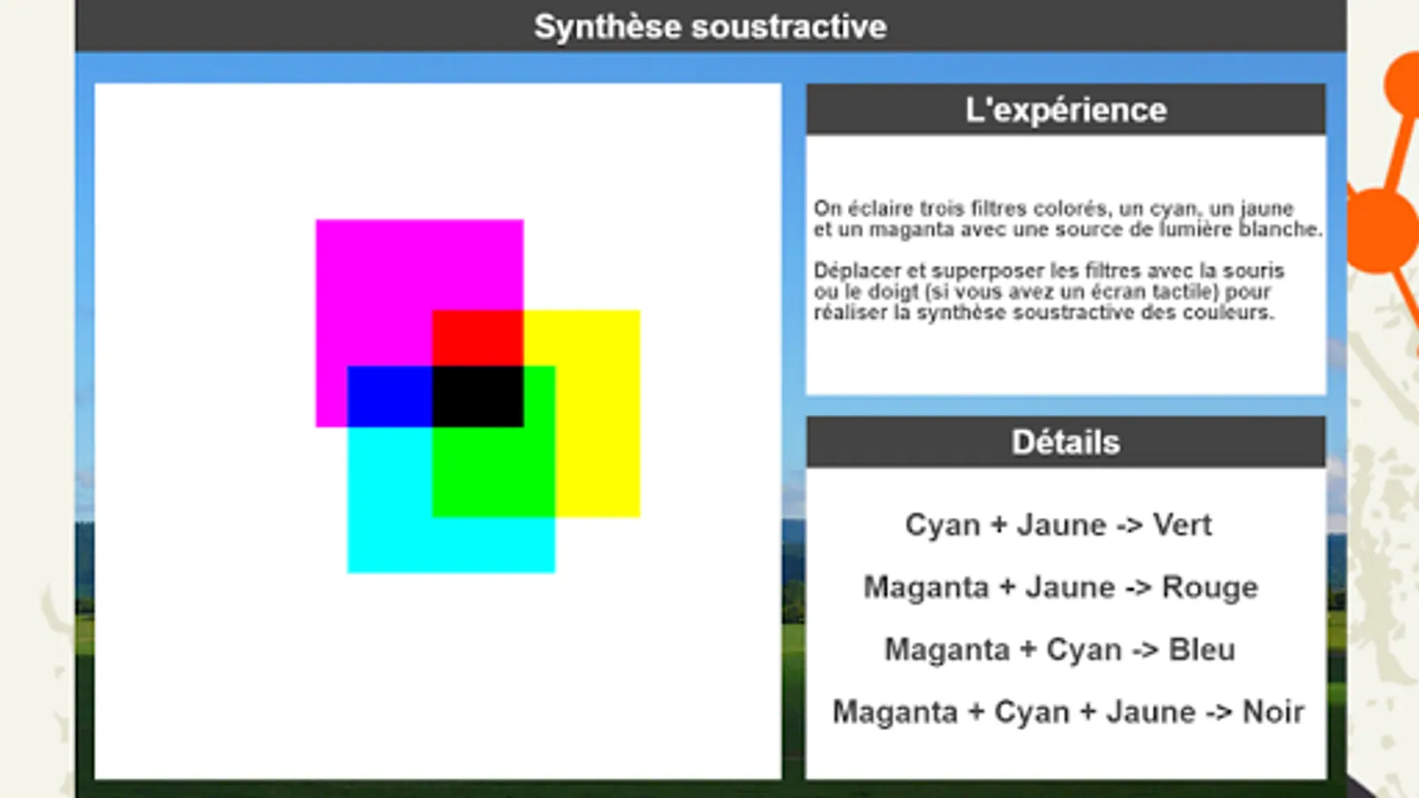 three color filters is illuminated, a cyan, magenta and yellow with a white light source. We must move and layer filters with the mouse or finger (if you have a touch screen) to perform subtractive color.