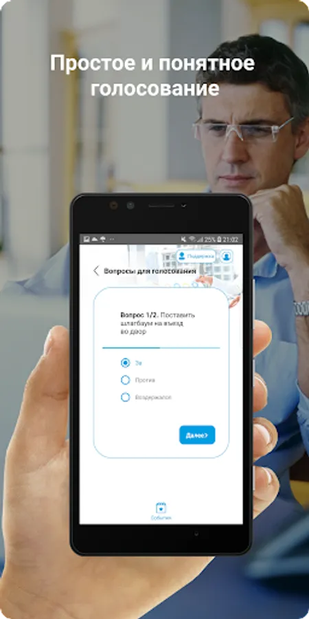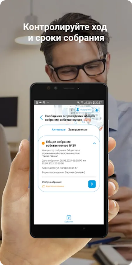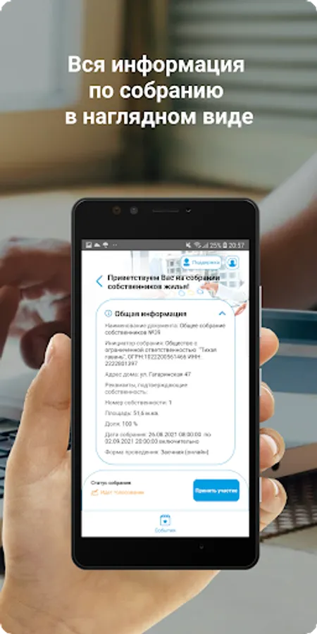 The first face-to-face vote is not required. You will be able to accept the system immediately at an online meeting. The owners of apartment blocks will be able to vote using mobile applications, which will take 5-10 minutes of their time.