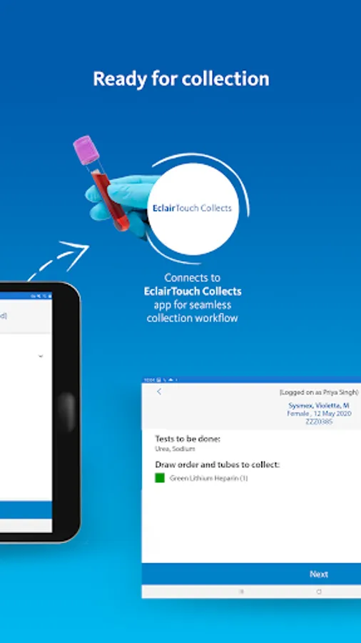 EclairTouch Collect is a dedicated collection management app developed to assist phlebotomists with the specimen collection workflow. It is designed to: