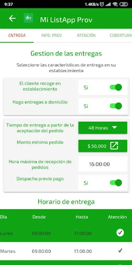 5. Quickly configure the hours of operation, delivery, shipping coverage of your business, among others.