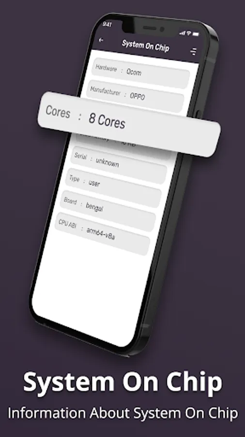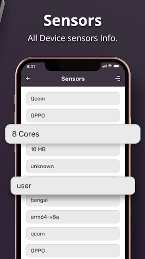 All Device Information such as System Info, System on Chip Info, Battery Information, and Device Information with All Supported Sensors Information.