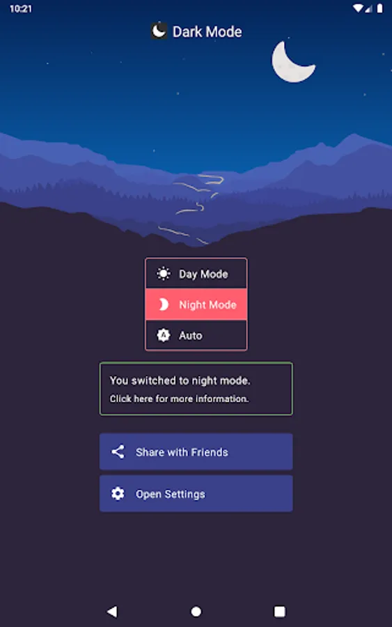 This app helps to activate the Android night mode on devices that do not provide this option in the system settings.
