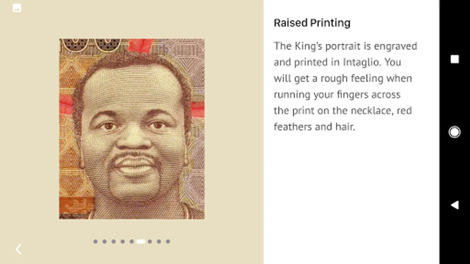 The ‘Lilangeni’ app allows users to discover the security features of currently circulated banknotes. It explains in an interactive way how the security feature react when a banknote is tilt, hold against the light or if a magnifier glass is used.