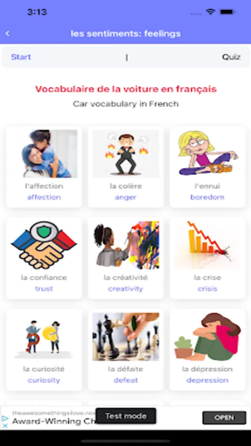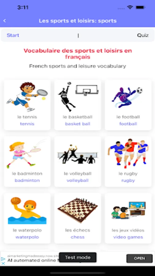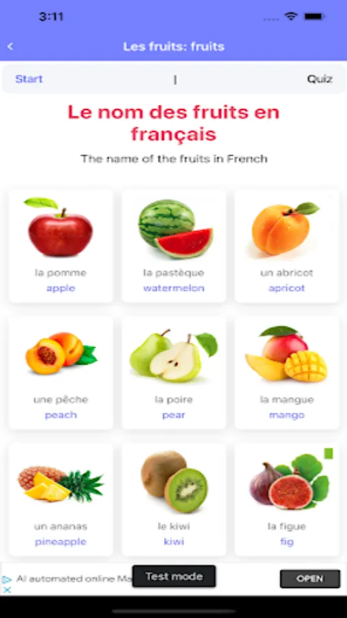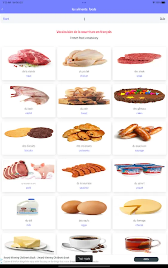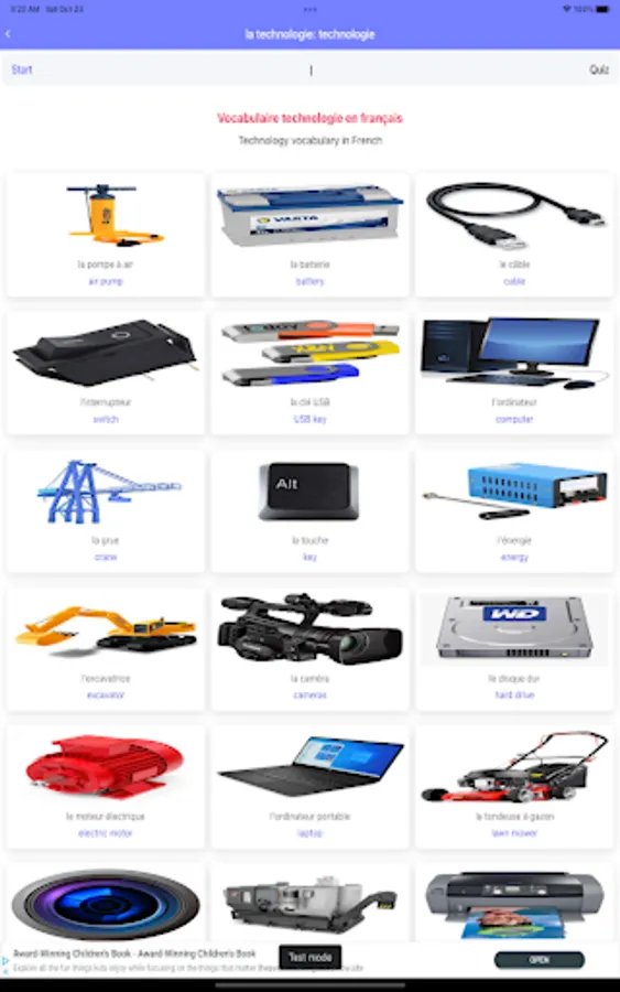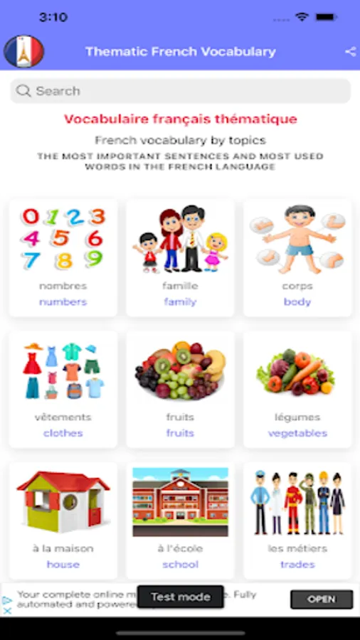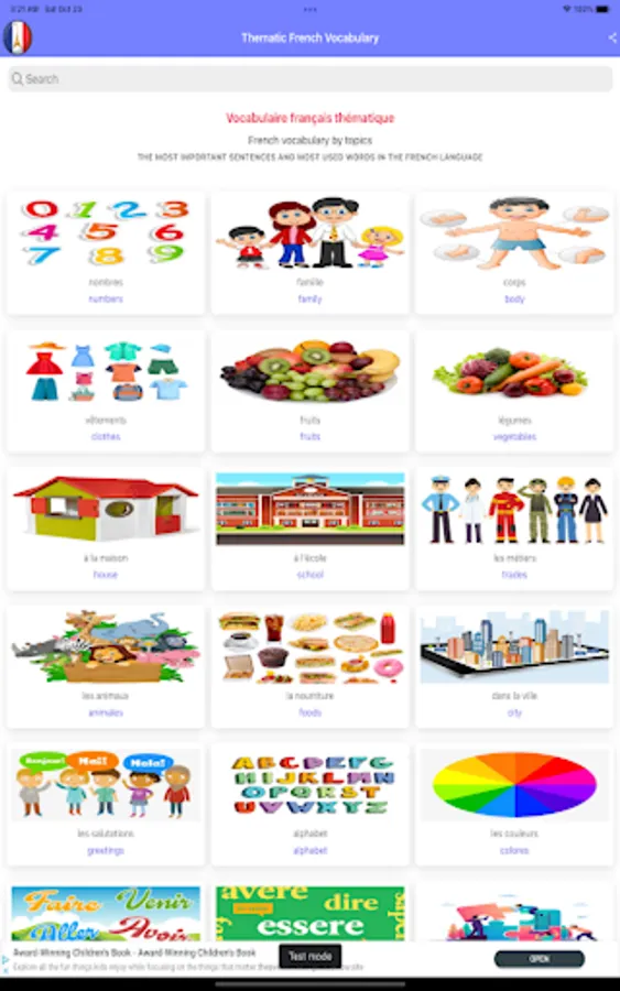 The application of the vocabulary of the French language is rich in words and pictures with sounds in all areas of life in the sections such as vegetables, travel, transportation, health, technology, etc…. And more topics with entertaining exercises.