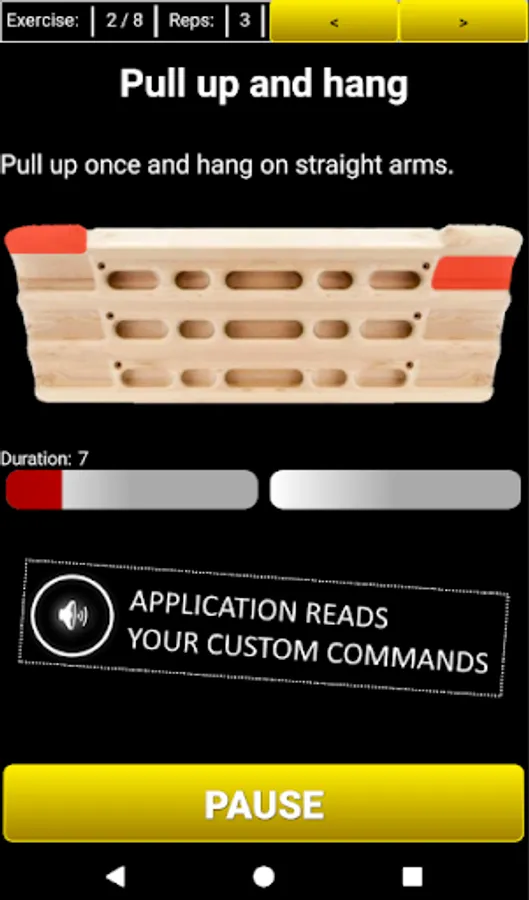 Application gives voice commands (of course TextToSpeach data in your android settings should be installed) telling you which exercises you have to do, how long you should rest, how many series etc.
