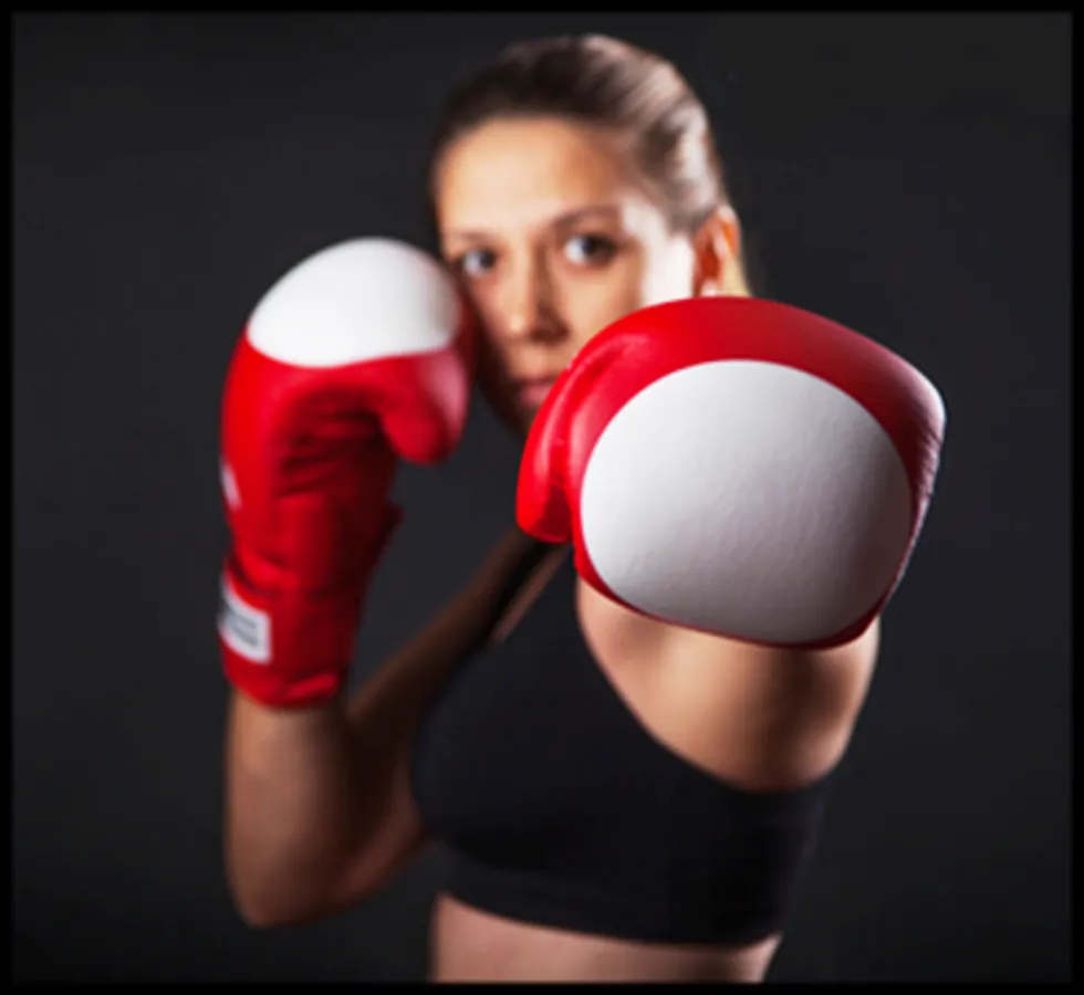 Tutorial with images of learning boxing punches for children, beginner women... at home, with gloves and a bag.