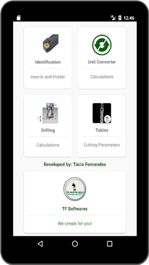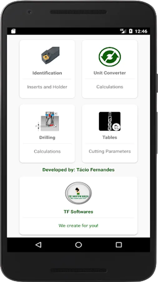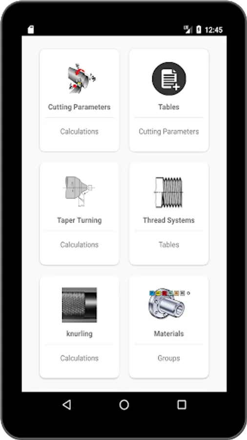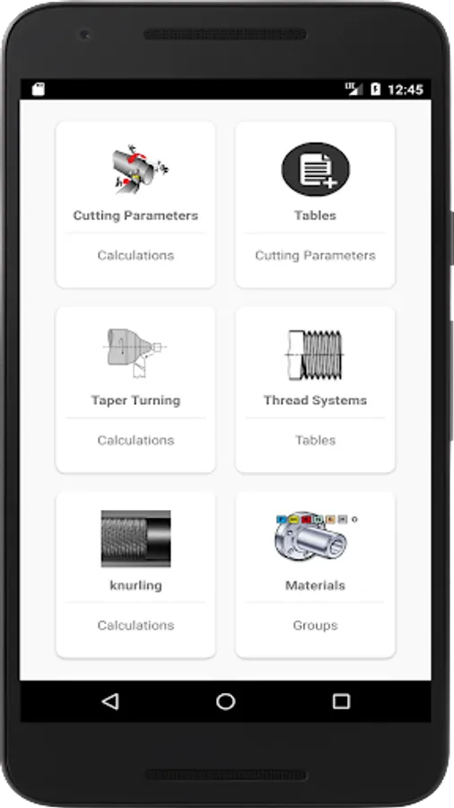 The application allows the user to calculate the Cutting Speed, RPM, Cut Time, Taper Turning, among others ...