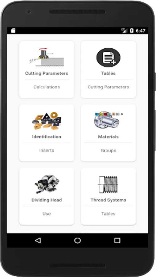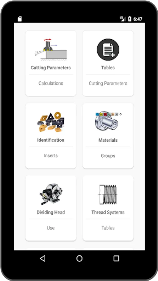 The application allows the user to calculate the Cutting Speed, RPM, Cut Time, among others ...