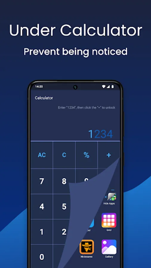 Secret calculator can help you to hide any app, and keep your privacy by hiding apps. You can open hidden apps in the Hide Apps or the interface of your Phone.