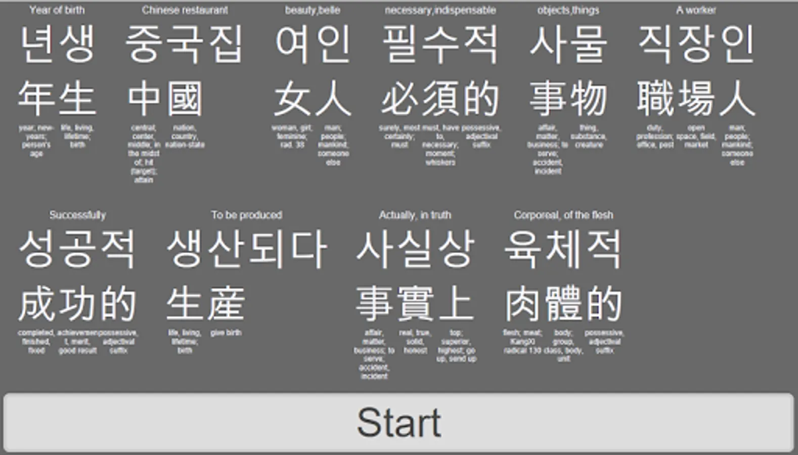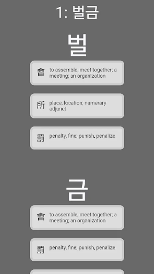 Before you stop reading - you don't need to know anything about Chinese characters to benefit from this app! The easier levels focus on the more common characters, which you can start to recognize very quickly. For example, you may not know what '學' means, but you'll come to recognise it as '배울 학': the '학' that means "learn"/"study" in words like '학교', '학생', '과학' and so on. Of course if you do know some of the Chinese characters themselves (or if this program inspires you to start learning a few), you'll be able to benefit from this app even more deeply.