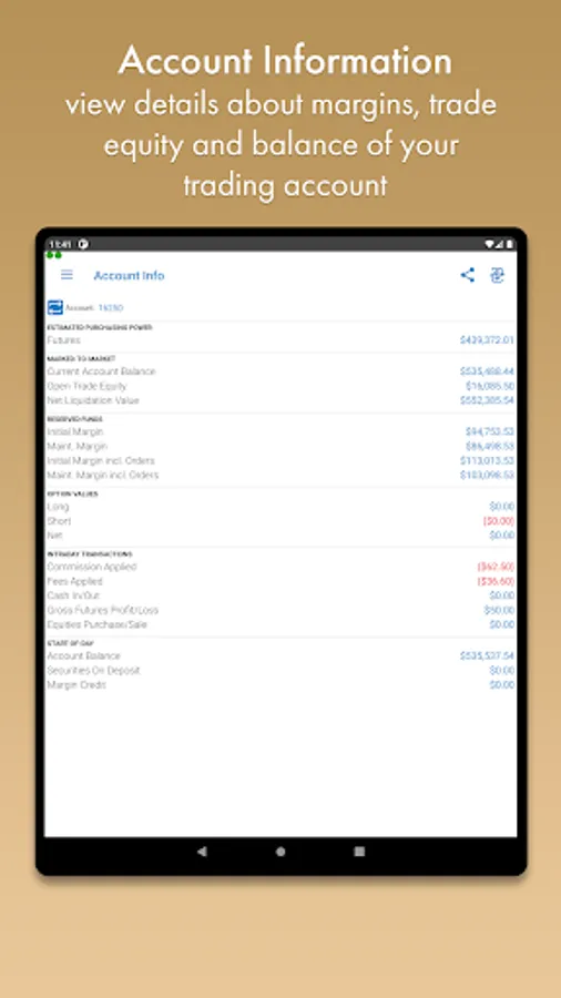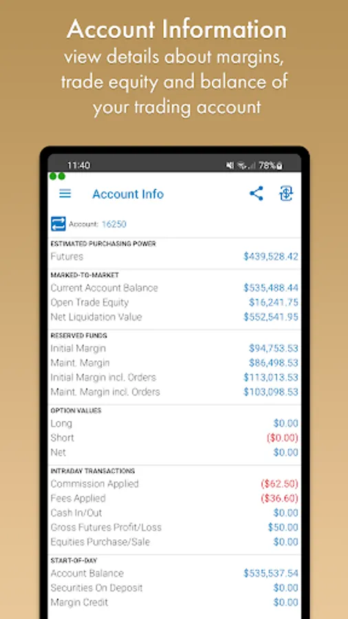 Account Information provides details about margins, trade equity and balance of your trading account. Quick account switching offers you a flawless transition between the accounts that comprise your portfolio.