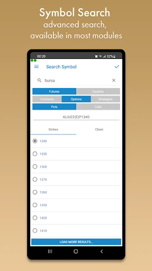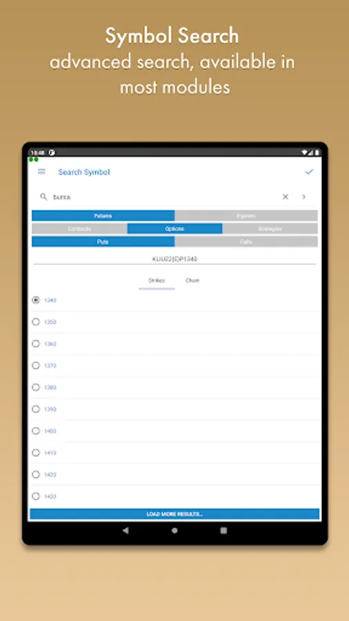 Advanced Symbol Search capabilities assist you in finding the correct symbol to compose any kind of contract in your Quotes Monitor. A Contract Details view will offer you complete info on any contract available in your Quotes Monitor.