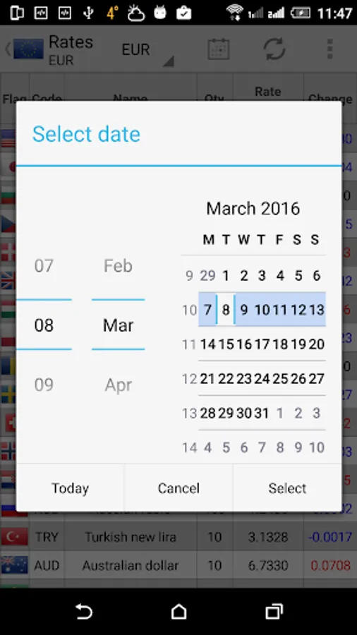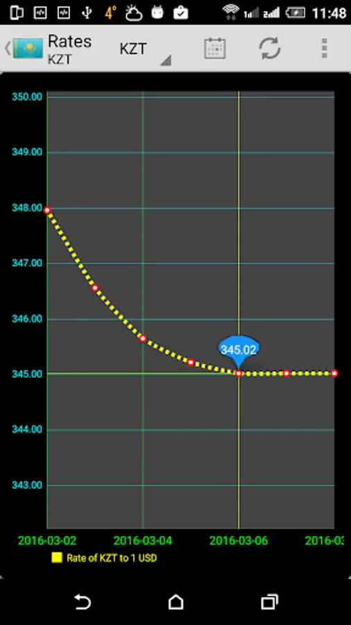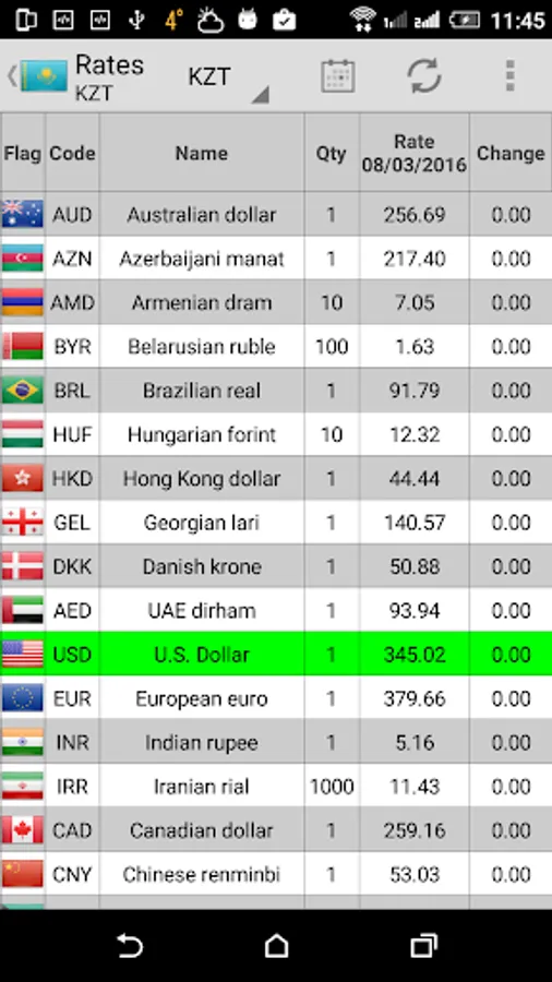 Official rates of Kazakhstan Tenge (KZT), Euro (EUR), Russian Rouble (RUB), Belarussian Rouble (BYR) , Uzbekistan Som (UZS), Azerbaijani Manat (AZN), Turkmenistan Manat (TMT), Ukraine Hryvna (UAH) and Kyrgyz Som (KGS) to other currencies for different dates. Any long press on cell will copy the cell contents into clipboard for further manipulations/calculations. Has dual-side embedded cross currency converter with simple calculator and widget.