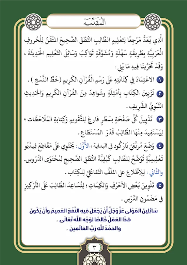 The book contains a well-studied scientific methodology for teaching the exits of the letters with examples that qualify the learner to enter the kindergarten of the Book of God Almighty.