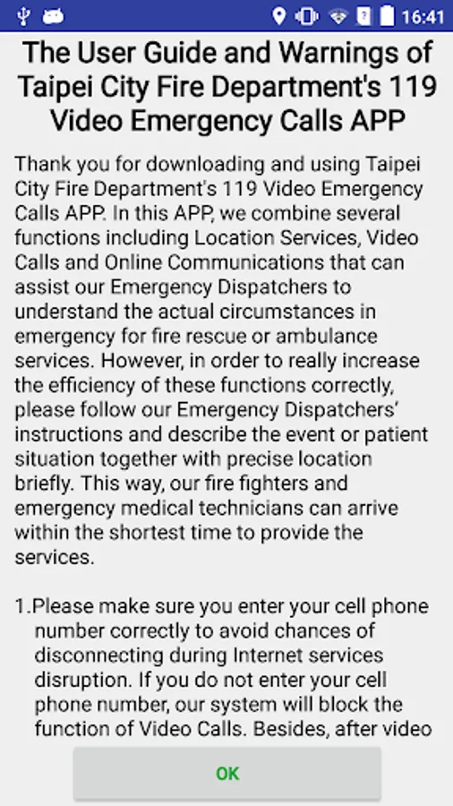 Due to the Taipei city 119 fire department wanting to strengthen their emergency service and better provide their help to the public in need, they have set up a new function provided for those in need and its call 119 video call. This function is an app that will allow the caller to video call the Taipei 119 dispatch center and report their incident through video call with their cellphone. This will not only help the dispatcher to better understand the incident but also will give them enough insight to properly guide the caller. The app will also provide service such as: sending GPS location, demonstrate CPR instruction video and help the dispatcher to send proper help base on the situation. *Note: due to the app using GPS location, internet and video call , it may use more cellphone battery than other apps.